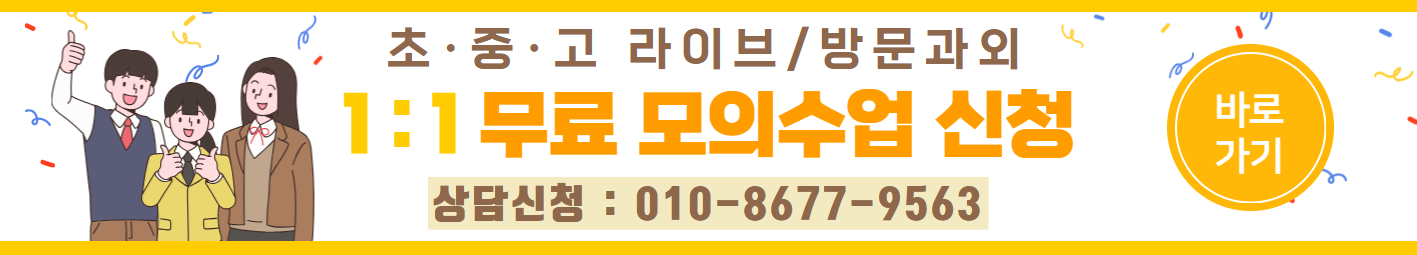 문의주시면 아이 성향에 맞게, 성적을 올릴 수 있는 선생님하고 1대1 무료모의수업체험 신청 도와드리겠습니다! 전문성있는 수업으로 함께 성적 올려보아요!