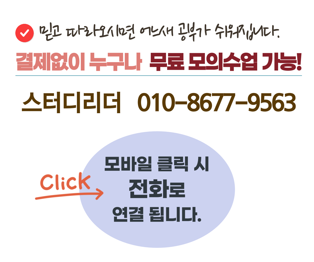 문의주시면 아이 성향에 맞게, 성적을 올릴 수 있는 선생님하고 1대1 무료모의수업체험 신청 도와드리겠습니다! 전문성있는 수업으로 함께 성적 올려보아요!