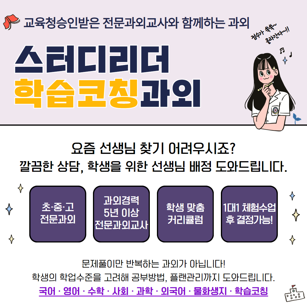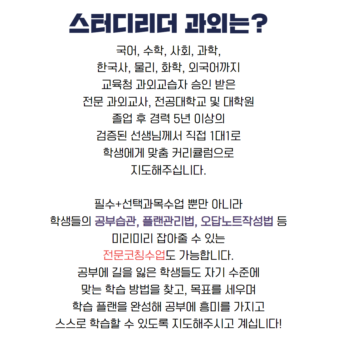수업은 방문과 화상 모두 가능하시며 과목별 학년별로 세분화된 커리큘럼으로 체계적인 수업을 진행하고 있습니다~
