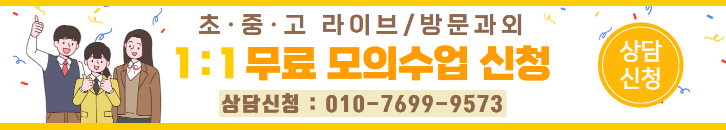 문의주시면 아이 성향에 맞게, 성적을 올릴 수 있는 선생님하고 1대1 무료모의수업체험 신청 도와드리겠습니다! 전문성있는 수업으로 함께 성적 올려보아요!