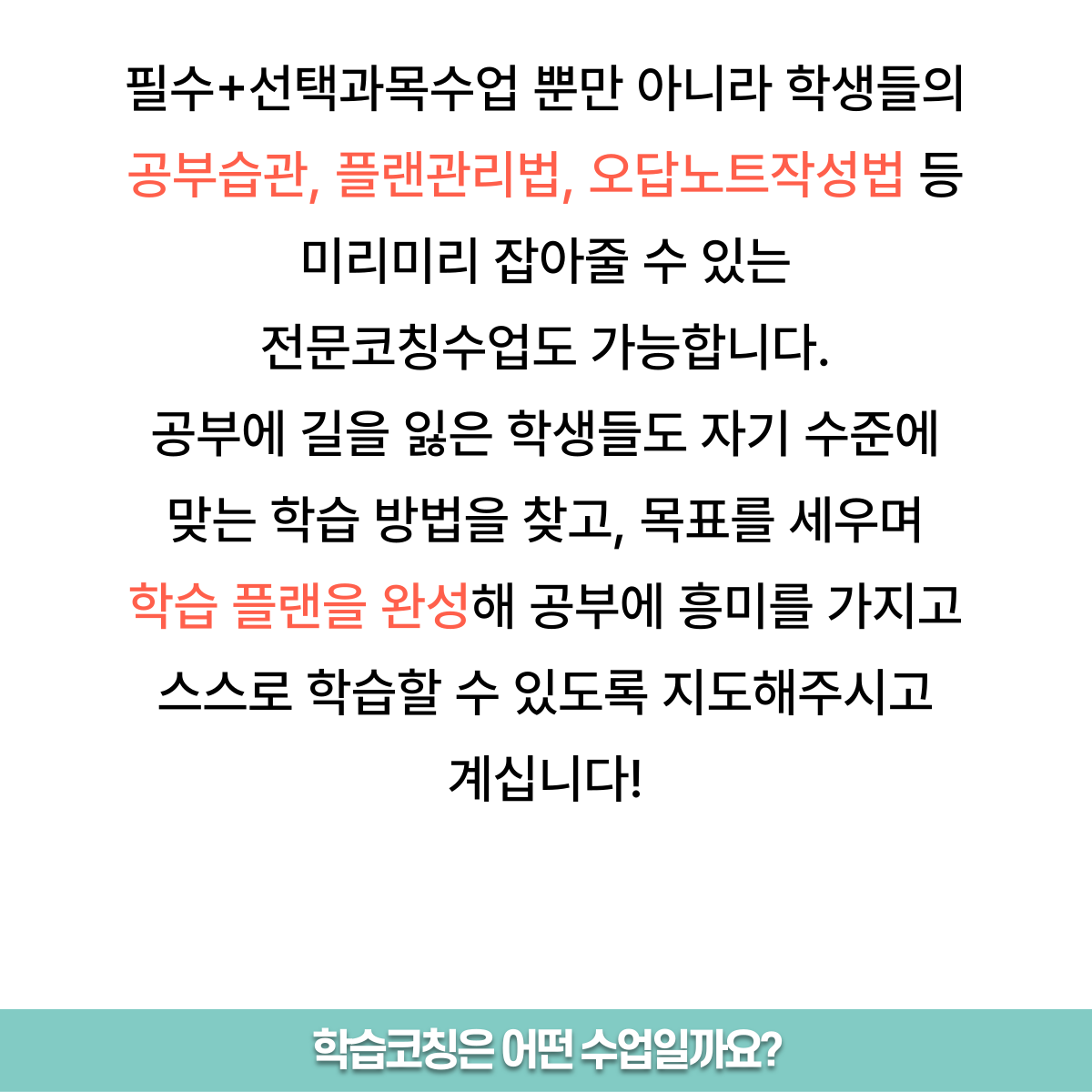 ★ 중,고등 전담강사는 내신대비를 꼼꼼히 하고, 공부하는 방법과 자기주도학습 습관 관리를 함께합니다.