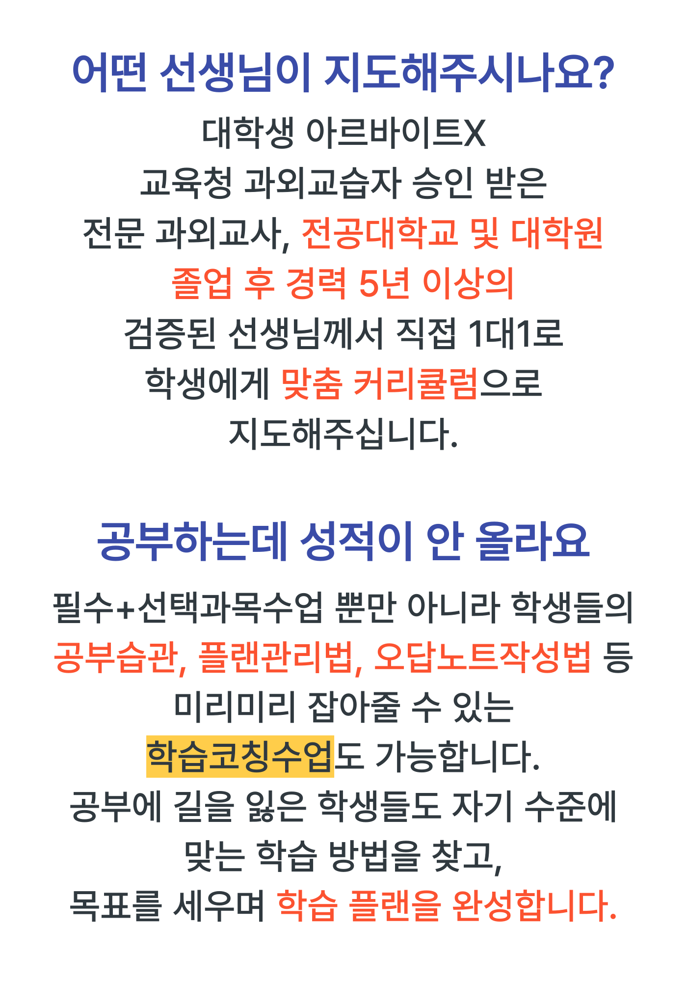 아이와 가장 잘 맞는 선생님으로, 아이와 가장 잘 맞는 커리큘럼으로, 원하는 성적, 목표를 함께 이룰 수 있도록 도와줍니다!