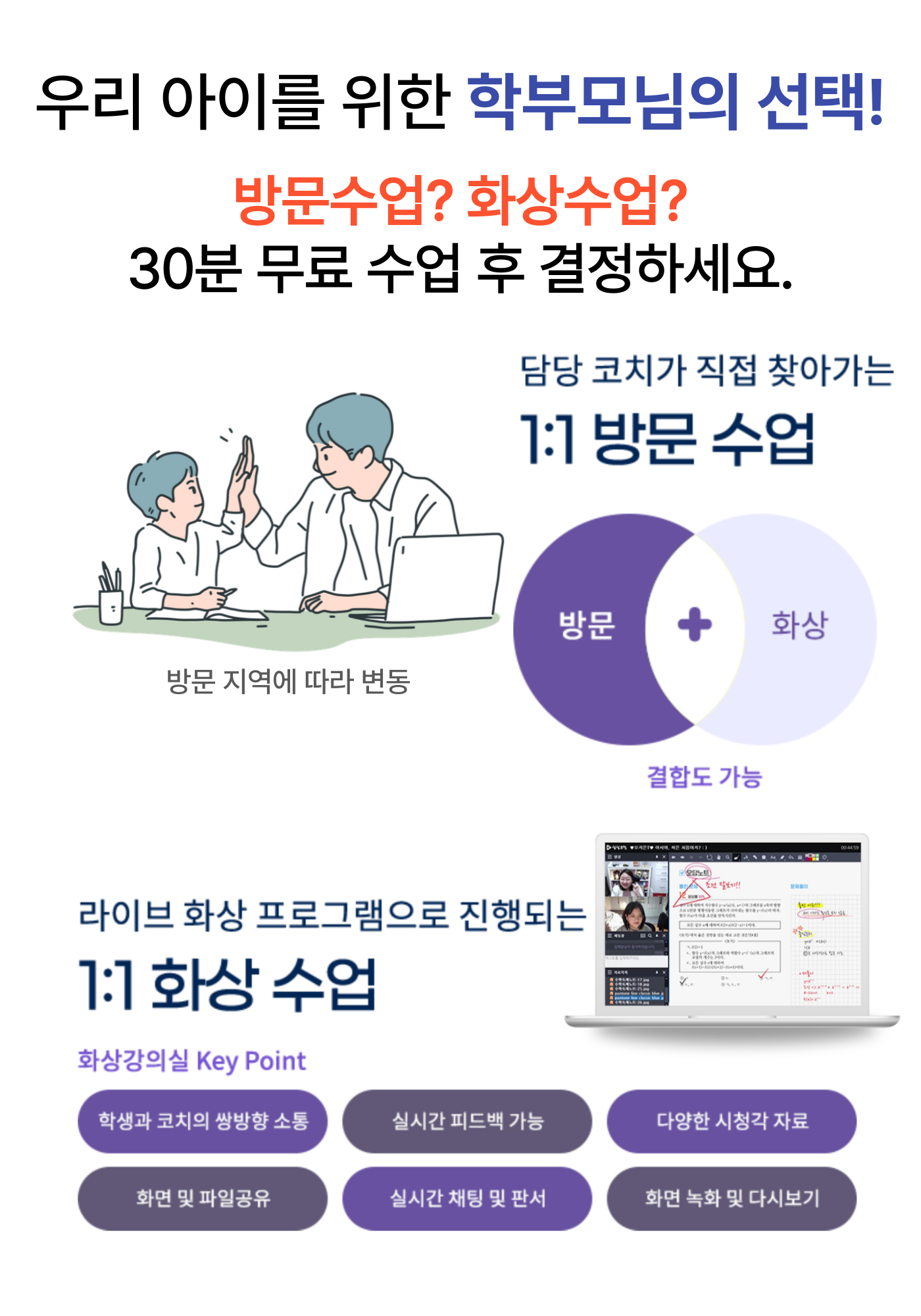1대1 무료 모의수업(30분) 체험 후 수업결정하실 수 있습니다.